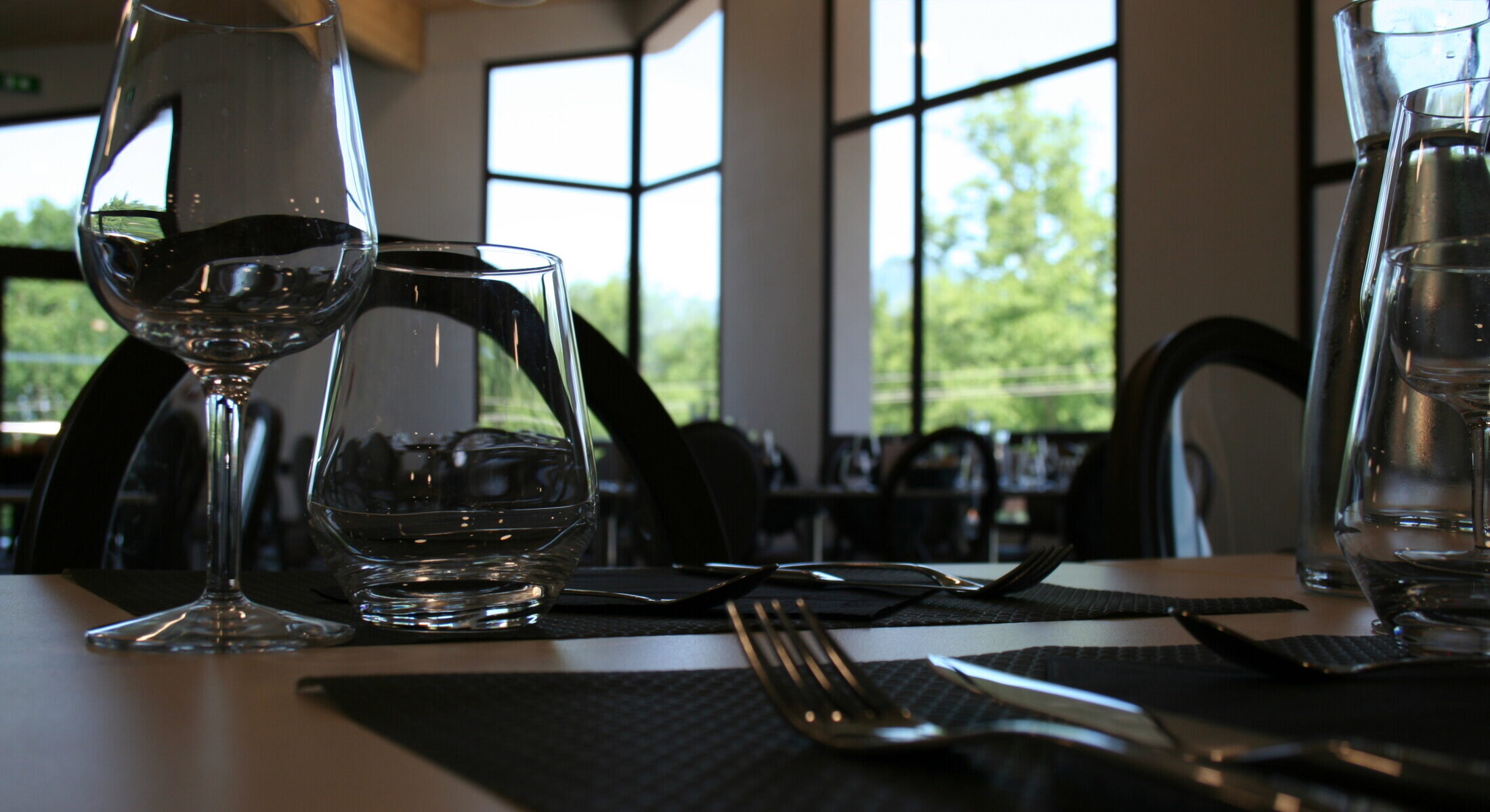 The large dining room at Pré du Lac offers stunning views of the surrounding mountains! With its big windows and glass doors, this dining area is warm and filled with natural light. To enjoy the sunshine during your meals, the restaurant extends onto panoramic terraces on both sides of Pré du Lac.