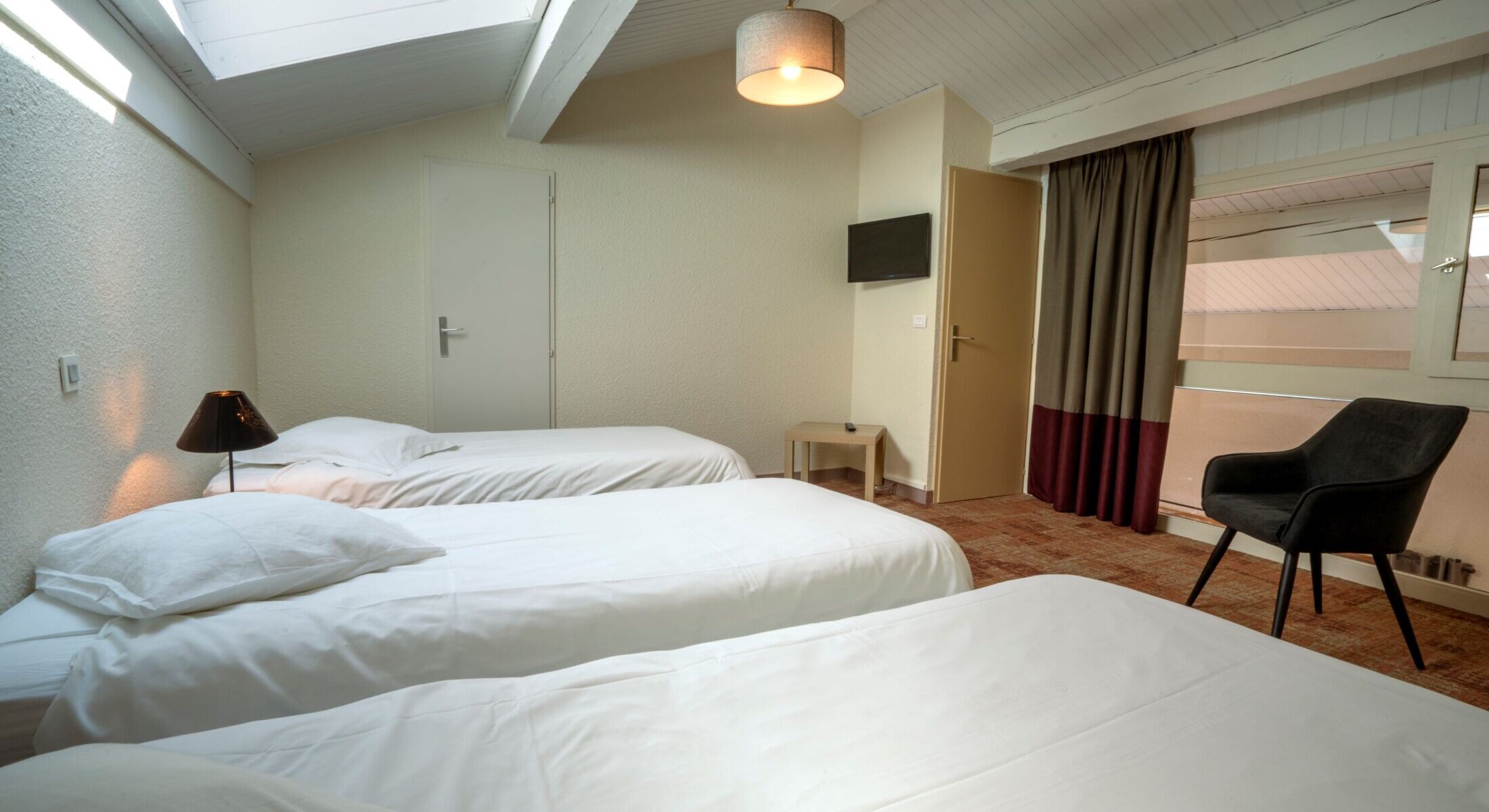 Duplex of approximately 45m² featuring 2 bedrooms. On the ground floor: 1 double bed (160×200); upstairs: 2 or 3 single beds (90×200). 1 shared bathroom with walk-in shower and separate WC. TV in each bedroom. Balcony in most units.