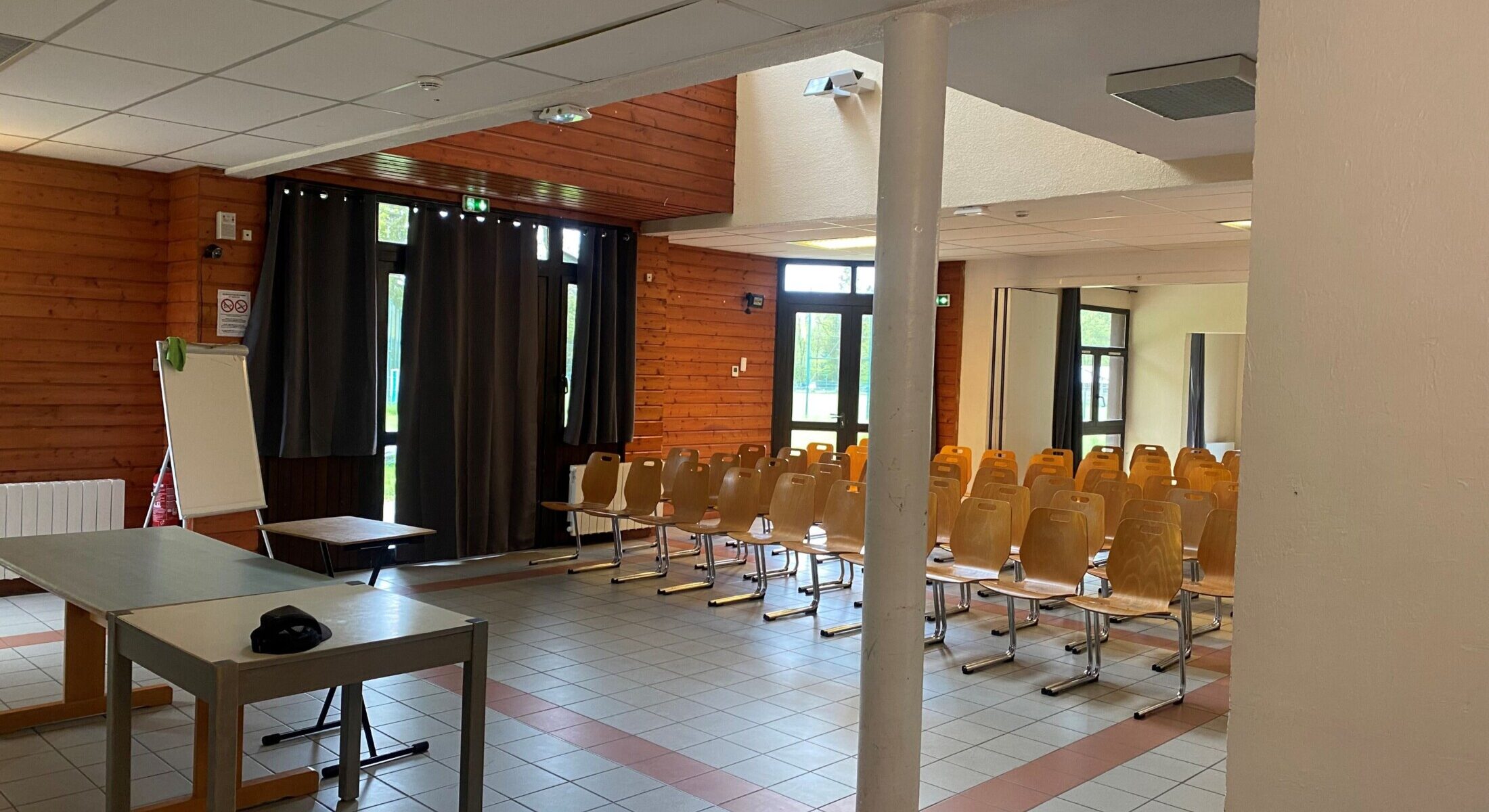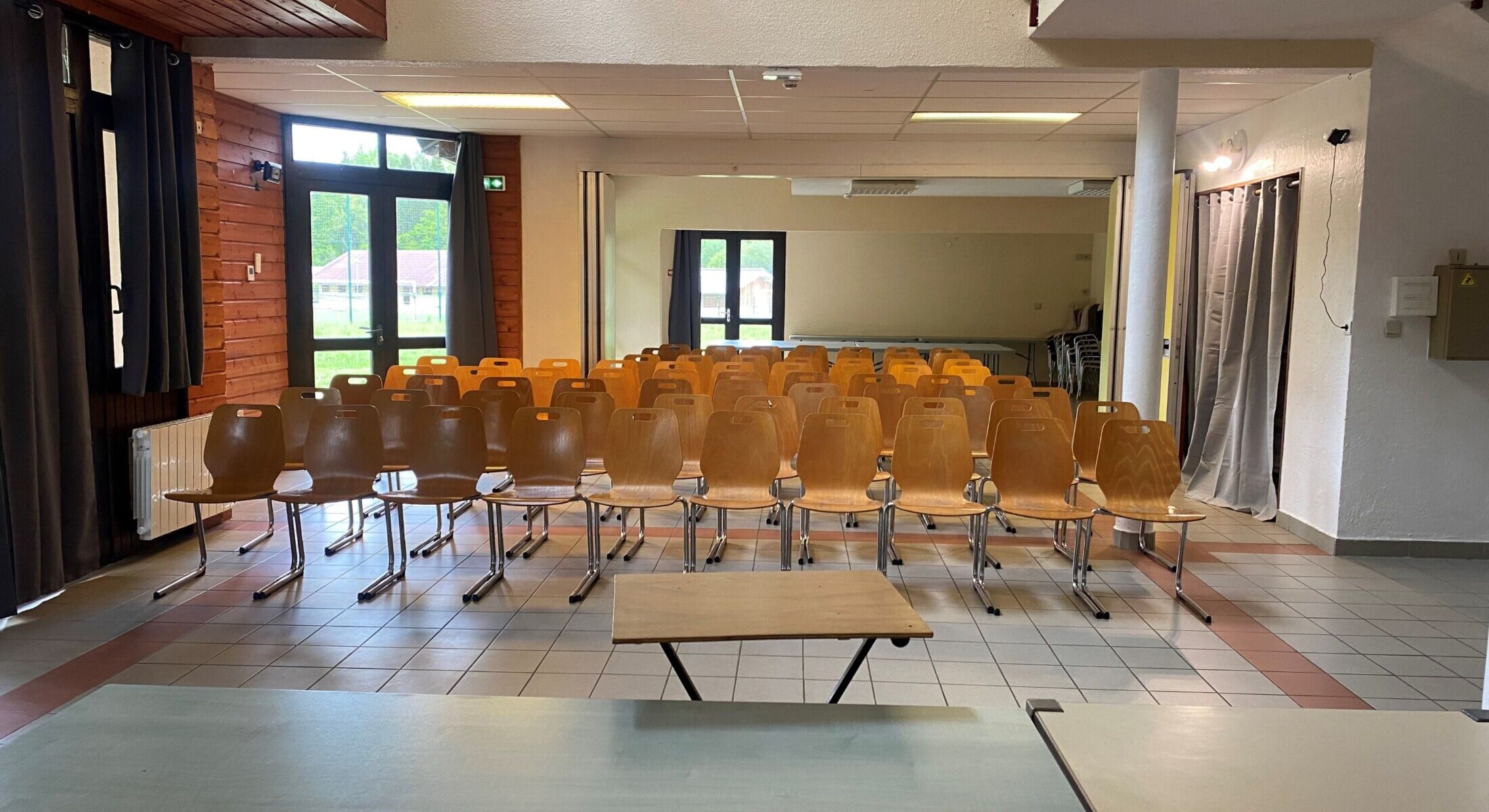 La Grande salle peut être coupée en 2 espaces distincts de 60m² par le jeu d’une cloison amovible.